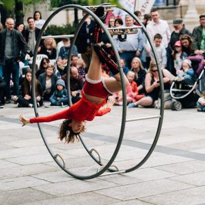 WE CAN DO IT! è una performance originale che combina il virtuosismo della German Wheel (ruota acrobatica) con elementi di teatro fisico, giocoleria ed improvvisazione con il pubblico.